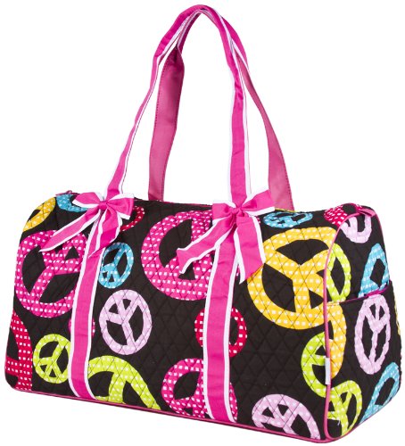 Don't get lost in a sea of black luggage! Stand out in style with this fun quilted black with multicolor peace signs print with pink ribbon trim duffle! This piece of lightweight luggage is great for jetsetters and can be used for a quick, close by staycation or for a weekend excursion to your favorite retreat. It's chic and fashionable design makes it a perfect choice for transporting gear for dance teams and cheer squads too! You can carry your cute duffle by the durable shoulder straps or slide it easily over the handle of a rolling suitcase for stress-free and efficient, stylish transport. Bows are detachable. Fully lined with black linen, keeping it clean is easy! Never lose your boarding pass, ID, or other smaller items with exterior velcro pockets on either end of this security checkpoint friendly bag.