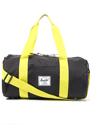 HERSCHEL SUPPLY Men's The Sutton Mid Volume Duffle Bag. The HERSCHEL SUPPLY Sutton Duffle Bag in Black & Lime This ultra durable HERSCHEL SUPPLY duffle bag features a removable and adjustable shoulder strap. With tons of room, this duffle is perfect for an overnight bag. Main zipper closure Leather zipper pulls Front sleeve pocket Fabric: 100% polyester Measures 23.5” W x 13.5” H x 13.5” D Imported By HERSCHEL SUPPLY.