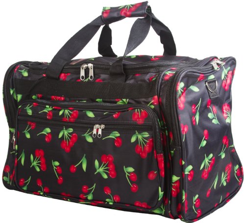 Don't get lost in a sea of black luggage! Stand out in style with this fun black with red cherries print duffle with black trim! This piece of lightweight luggage is great for jetsetters and can be used for a quick, close by staycation or for a weekend excursion to your favorite retreat. It's chic and fashionable design makes it a perfect choice for transporting gear for dance teams and cheer squads too! You can carry your cute duffle by its included durable, detachable shoulder strap or slide it easily over the handle of a rolling suitcase for stress-free and efficient, stylish transport. Never lose your boarding pass, ID, or other smaller items with exterior zipper compartments on the front and sides of this security checkpoint friendly bag. Fully lined with black linen, keeping it clean is easy! This multipurpose bag can also be used as an attractive diaper bag for the mom on the go!