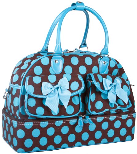 Don't get lost in a sea of black luggage! Stand out in style with this fun brown and turquoise blue polka dot print bowling style duffle! This piece of lightweight luggage is great for jetsetters and can be used for a quick, close by staycation or for a weekend excursion to your favorite retreat. It's chic and fashionable design makes it a perfect choice for transporting gear for dance teams and cheer squads too! This duffle features a bottom zipper compartment for shoes and other additional storage. You can carry your cute duffle by its included durable, detachable shoulder strap or slide it easily over the handle of a rolling suitcase for stress-free and efficient, stylish transport. Fully lined with black linen, keeping it clean is easy! Never lose your boarding pass, ID, or other smaller items with two exterior pockets on the front of this security checkpoint friendly bag.