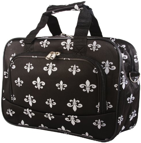 This piece of lightweight luggage is great for jetsetters and can be used for a quick, close by staycation or for a weekend excursion to your favorite retreat. You can carry your overnight bag by its included durable detachable shoulder strap or slide it easily over the handle of a rolling suitcase for stress-free and efficient, stylish transport. This small cute carryon can stand alone on sturdy plastic feet and is made of hard-wearing microfiber in trendy black and silver Fleur De Lis print. Never lose your boarding pass, ID, or other smaller items with exterior zipper compartments located on both sides. Fully lined with black linen, keeping it clean is easy! This multipurpose bag can also be used as an attractive diaper bag for the mom on the go or is large enough to fit notebooks and binders in for a quirky book bag or briefcase.