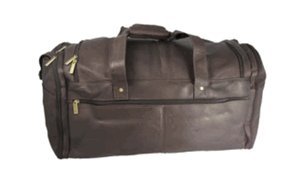 A large duffel with a number of packing options. The large main compartment with U-shaped zipper holds an entire weekend's clothes. In addition there are two zippered end pockets ideal for separating laundry from clean clothes or you could store your toiletry kit in one and cell phone and PDA in the other. Front and rear zippered pockets too. An inside zippered pocket adds a measure of security for wallet or jewelry. Removable shoulder strap included. Our soft rich vacquetta leather displays all the character provided by nature making each piece unique. Our tanning process locks in natural oils producing a soft durable hand that won't crack or become brittle with normal use. Occasional maintenence with a high-quality conditioner is recommended for lasting performance. Top "U"-zip opening. Plenty of pockets. Leather handle wrap. Adjustable and removable nylon strap. Weather resistant nylon bottom. Dimensions: 18" x 12.5" x 10". Colors: Cafe.