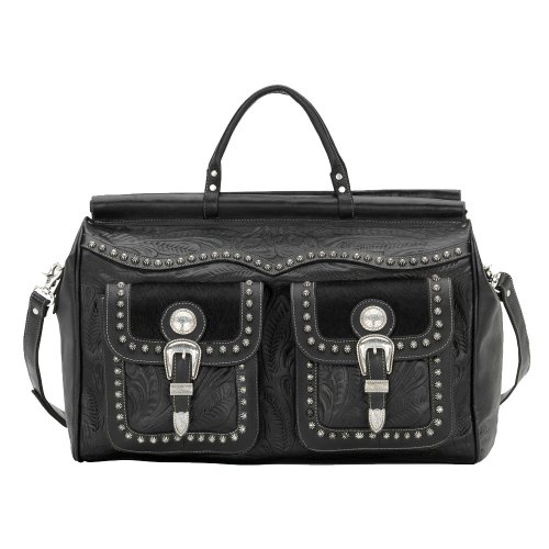 American West Midnight Trails Collection Duffel Bag, durable, attractive and functional. The black hand tooled leather, black hair-on cow hide, antiqued silver spots, conchos, and three piece buckle sets blend together to create