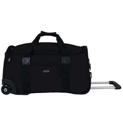 RF-22 BLACK Color: Black Features: -Carry-on size wheeled duffel.-Soft and noiseless wheels.-Expandable main compartment for more storage.-Detachable and adjustable shoulder strap.-Zippered exterior pockets for last minute accessories.-Hoop and loop padded handle wrap. Construction: -Constructed of 600D polyester. Dimensions: -Dimensions: 13'' H x 22'' W x 9.5'' D. Warranty: -Limited lifetime warranty.