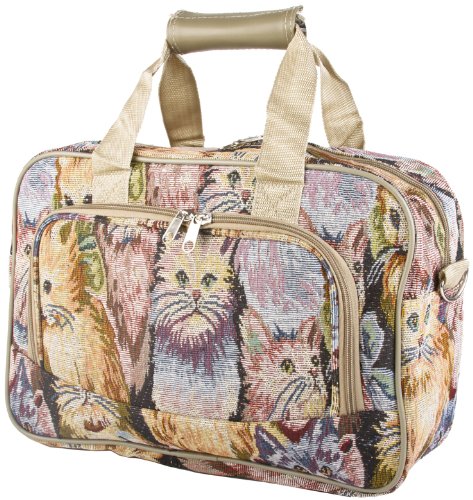 This piece of lightweight luggage is great for jetsetters and can be used for a quick, close by staycation or for a weekend excursion to your favorite retreat. You can carry your overnight bag by its included durable detachable shoulder strap or slide it easily over the handle of a rolling suitcase for stress-free and efficient, stylish transport. This small cute carryon can stand alone on sturdy plastic feet and is made of hard-wearing microfiber in trendy cat tapestry. Never lose your boarding pass, ID, or other smaller items with exterior zipper compartments located on both sides. Fully lined with black linen, keeping it clean is easy! This multipurpose bag can also be used as an attractive diaper bag for the mom on the go or is large enough to fit notebooks and binders in for a quirky book bag or briefcase.