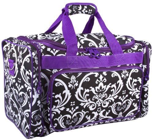 Don't get lost in a sea of black luggage! Stand out in style with this fun black and white damask floral print with purple trim! This piece of lightweight luggage is great for jetsetters and can be used for a quick, close by staycation or for a weekend excursion to your favorite retreat. It's chic and fashionable design makes it a perfect choice for transporting gear for dance teams and cheer squads too! You can carry your cute duffle by its included durable, detachable shoulder strap or slide it easily over the handle of a rolling suitcase for stress-free and efficient, stylish transport. Fully lined with black linen, keeping it clean is easy! Never lose your boarding pass, ID, or other smaller items with exterior zipper compartments on the front of this security checkpoint friendly bag. Fits underneath airplane seats or in overhead compartments!