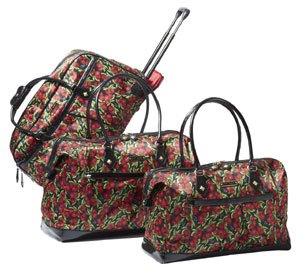 This 3 Piece Set from Betsey Johnson consists of two weekenders and a rolling duffel. The weekenders are great for day trips to the beach or around town. Feature a roomy interior with lots of pocket space and a Betsey Johnson Black Cherry print on the outside with signature Betsey Johnson lining on the interior. The duffel is made to follow your lead through tight corners and congested areas with its recessed in-line wheels.
