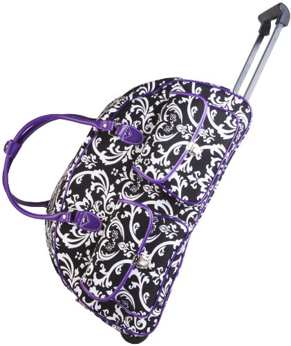 Purple Trim Damask Floral Duffle Wheeled Rolling Bag