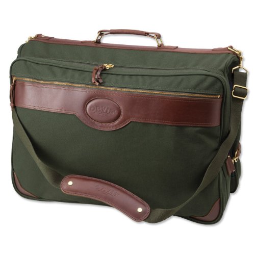 Carry a week's worth of suits and keep them neat and wrinkle free. Our new garment bag features twin universal hanger clamps, four gusseted shoe pockets, and a gusseted outside pocket for shirts and accessories. Two external flat zippered pockets. Adjustable shoulder strap included. Garment bag is made of rugged Battenkill cotton canvas with plaid lining and genuine leather trim. In green. 40"L x 24"W x 5"D when unfolded; 20"L x 24"W x 7"D when folded. 5,000 cu. in. Personalize with engraving on a brass plate, up to 6 letters. Imported.