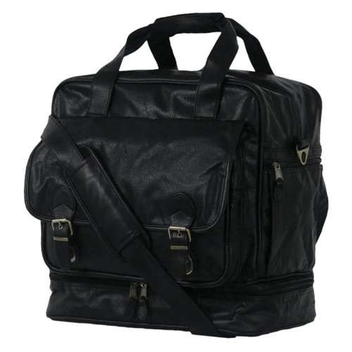 One main compartment. End to end zippered opening. Zippered pocket on each end. Bottom pocket with double zippered U shaped opening. Front zippered pouch with an exterior zippered pocket both concealed by buckle fastened flap. Reinforced snap fastened handle with detachable and adjustable shoulder strap. Shoulder strap with no slip pad. 16 in. L x 15 in. W x 10 in. H