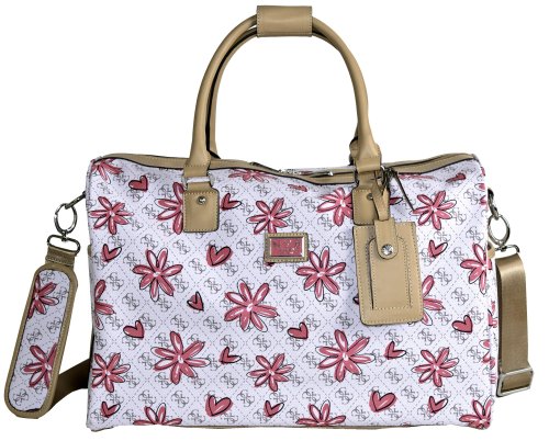 S3437930-WHI Color: White Features: -Vachetta PU trimmed.-Shiny silver hardware.-4 G Logo print with sketch flowers on coated PVC.-Softside.-Detachable ID tag.-Fully lined Guess printed logo.-Removable shoulder strap. Dimensions: -Dimensions: 18" H x 8.5" W x 12" D. Warranty: -5 Year limited warranty.