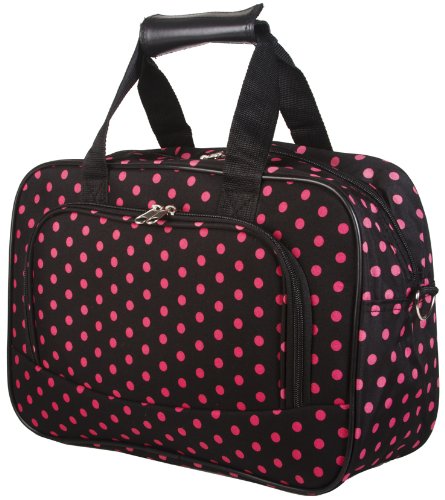This piece of lightweight luggage is great for jetsetters and can be used for a quick, close by staycation or for a weekend excursion to your favorite retreat. You can carry your overnight bag by its included durable detachable shoulder strap or slide it easily over the handle of a rolling suitcase for stress-free and efficient, stylish transport. This small cute carryon can stand alone on sturdy plastic feet and is made of hard-wearing microfiber in trendy black and pink polka dot print. Never lose your boarding pass, ID, or other smaller items with exterior zipper compartments located on both sides. Fully lined with black linen, keeping it clean is easy! This multipurpose bag can also be used as an attractive diaper bag for the mom on the go or is large enough to fit notebooks and binders in for a quirky book bag or briefcase.