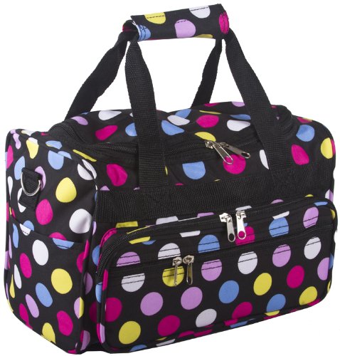 Don't get lost in a sea of black luggage! Stand out in style with this fun black and multicolor polka dot print duffle! This piece of lightweight luggage is great for jetsetters and can be used for a quick, close by staycation or for a weekend excursion to your favorite retreat. It's chic and fashionable design makes it a perfect choice for transporting gear for dance teams and cheer squads too! You can carry your cute duffle by its included durable, detachable shoulder strap or slide it easily over the handle of a rolling suitcase for stress-free and efficient, stylish transport. Never lose your boarding pass, ID, or other smaller items with exterior zipper compartments on the front of this security checkpoint friendly bag. Fully lined with black linen, keeping it clean is easy! This multipurpose bag can also be used as an attractive diaper bag for the mom on the go!