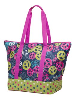 This Super Weekender features water resistant polyester, fully lined interior, solid platform base and zipper closure. Navy Peace pattern with lime green Dots highlights. Size 13" x 9" 14.5" tall with a strap drop 11".