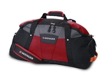 This black duffel from Wenger is designed to help you carry all the essentials when you leave home. It features a water bottle pocket, zippered wet pouch for toiletries, padded shoulder strap, carry handle, rope style zipper pulls, and a shoe pocket. Material: Nylon. Strap measurement: 44 inches. Exterior dimensions: 12" high x 24" wide x 9" deep.
