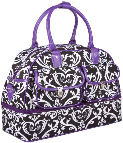 Don't get lost in a sea of black luggage! Stand out in style with this fun black and white damask floral print bowling style duffle with purple trim! This piece of lightweight luggage is great for jetsetters and can be used for a quick, close by staycation or for a weekend excursion to your favorite retreat. It's chic and fashionable design makes it a perfect choice for transporting gear for dance teams and cheer squads too! This duffle features a bottom zipper compartment for shoes and other additional storage. You can carry your cute duffle by its included durable, detachable shoulder strap or slide it easily over the handle of a rolling suitcase for stress-free and efficient, stylish transport. Fully lined with black linen, keeping it clean is easy! Never lose your boarding pass, ID, or other smaller items with two exterior pockets on the front of this security checkpoint friendly bag.
