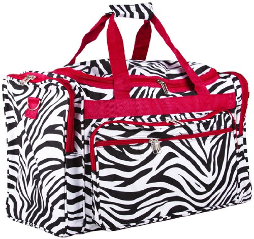 Don't get lost in a sea of black luggage! Stand out in style with this fun zebra print duffle with red trim! This piece of lightweight luggage is great for jetsetters and can be used for a quick, close by staycation or for a weekend excursion to your favorite retreat. It's chic and fashionable design makes it a perfect choice for transporting gear for dance teams and cheer squads too! You can carry your cute duffle by its included durable, detachable shoulder strap or slide it easily over the handle of a rolling suitcase for stress-free and efficient, stylish transport. Never lose your boarding pass, ID, or other smaller items with exterior zipper compartments on the front and sides of this security checkpoint friendly bag. Fully lined with black linen, keeping it clean is easy! This multipurpose bag can also be used as an attractive diaper bag for the mom on the go!